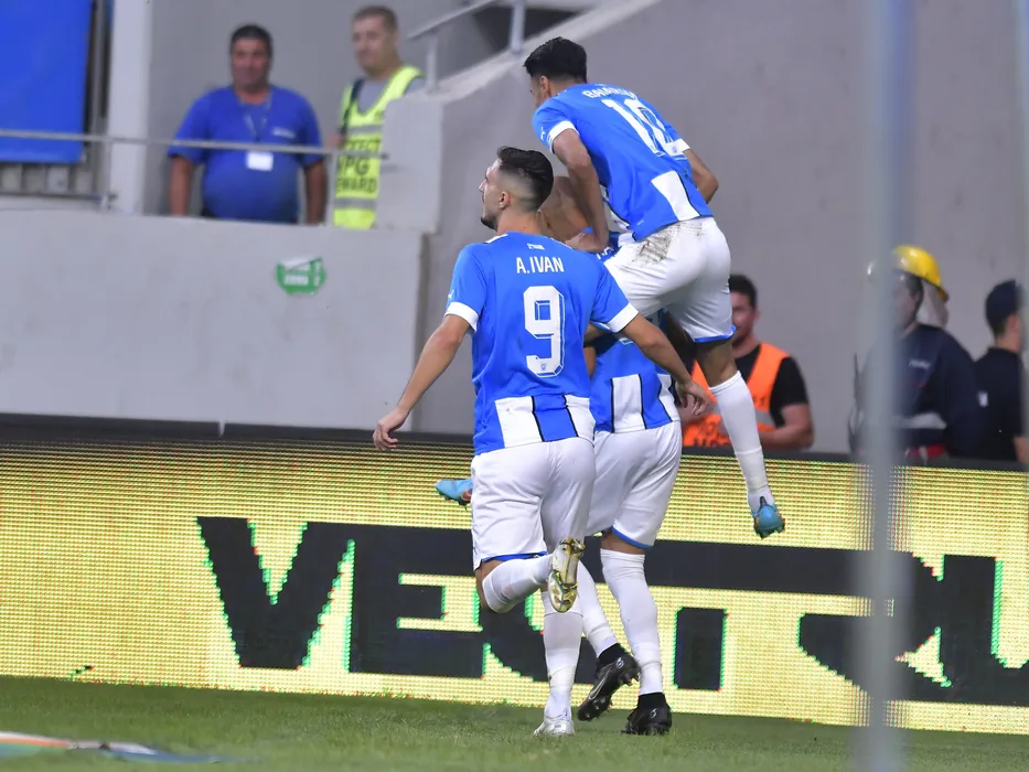 Raul Michel Melo Da Silva se bucura dupa un gol marcat alaturi de Andrei Virgil Ivan si Stefan Baiaram in meciul de fotbal dintre Universitatea Craiova si FC Zorya Luhansk, din cadrul UEFA Europa Conference League, desfasurat pe Stadionul Ion Oblemenco din Craiova, joi 11 august 2022. © FOTO:Razvan Pasarica/SPORT PICTURES