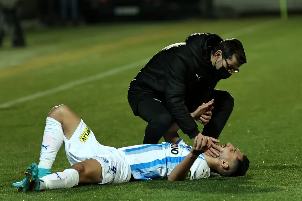 Andrei Ivan (jos), de la CS Universitatea Craiova, reactioneaza dupa ce s-a accidentat in timpul meciului de fotbal contra echipei Academica Clinceni din etapa a XXVII-a a Ligii 1, disputat pe stadionul Marin Anastasovici din Giurgiu din Bucuresti, luni, 21 februarie 2022. GEORGE FILIP / MEDIAFAX FOTO