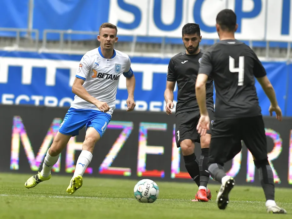 Nicusor Silviu Bancu si Florin Vasile Achim in meciul de fotbal dintre Universitatea Craiova si Academica Clinceni, contand pentru Play off-ul Ligii 1 Casa Pariurilor, desfasurat pe Stadionul Ion Oblemenco din Craiova, miercuri 26 mai 2021. © FOTO:Razvan Pasarica/SPORT PICTURES