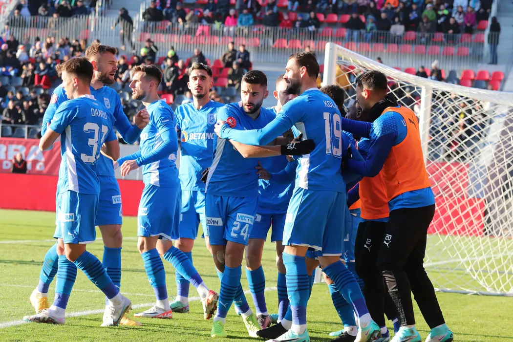 Bucurie craioveană cu Andrei Virgil Ivan, Ante Roguljic, Alexandru Crețu, Elvir Koljic în meciul de fotbal dintre AFC Hermannstadt Sibiu si Universitatea Craiova, contând pentru Superliga Superbet, desfășurat pe Stadionul Municipal din Sibiu, duminică 10 decembrie 2023. © FOTO: Valentin MACREA/SPORT PICTURES