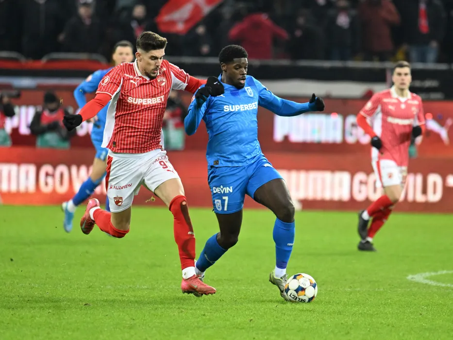 Iulius Andrei Marginean si Aime Steven Nsasa Nsimba Labe in meciul de fotbal dintre Dinamo Bucuresti si Universitatea Craiova, din cadrul Superligii Superbet, desfasurat pe Arena Nationala din Bucuresti, luni 9 februarie 2026. © FOTO:Razvan Pasarica/SPORT PICTURES