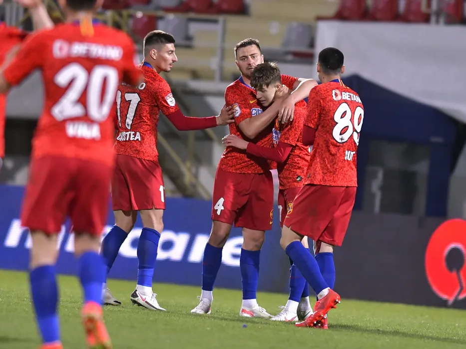 Bucurie a fotbalistilor stelisti dupa un gol marcat cu Iulian Lucian Cristea, Octavian George Popescu si Andrei George Miron in meciul de fotbal dintre FCSB si Sepsi OSK Sfantu Gheorghe, contand pentru Play-off-ul Ligii 1 Casa Pariurilor, desfasurat fara spectatori pe Stadionul Marin Anastasovici din Giurgiu, duminica 25 aprilie 2021. © FOTO:Razvan Pasarica/SPORT PICTURES
