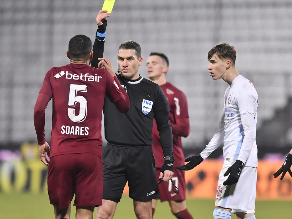 Arbitrul central Istvan Kovacs acorda un cartonas galben lui Yacouba Sylla sub privirea lui Octavian George Popescu in meciul de fotbal dintre CFR Cluj si FCSB, contand pentru Liga 1 Casa Pariurilor, desfasurat fara spectatori pe Stadionul Dr. Constantin Radulescu din Cluj Napoca, duminica 13 decembrie 2020. © FOTO:Razvan Pasarica/SPORT PICTURES