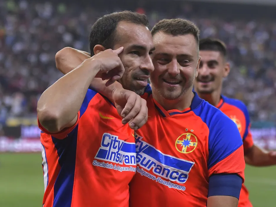 Paulo Vinicius De Souza Nascimento se bucura dupa un gol marcat alaturi de Andrei George Miron in meciul de fotbal dintre FCSB si Dinamo Bucuresti, contand pentru Liga 1 Casa Pariurilor, desfasurat pe Arena Nationala din Bucuresti, duminica 12 septembrie 2021. © FOTO:Razvan Pasarica/SPORT PICTURES