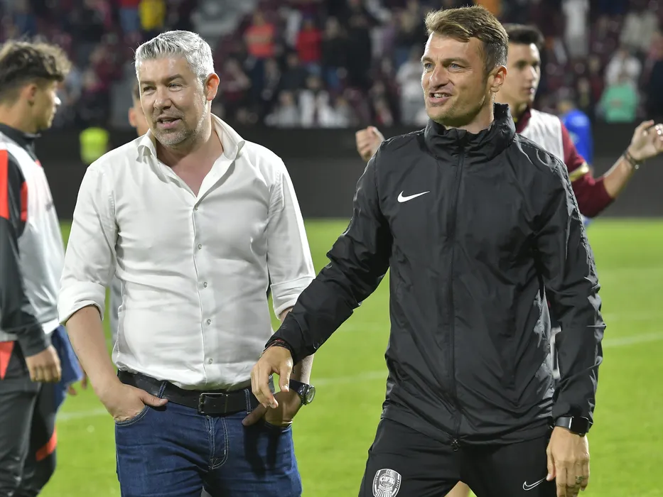 Bogdan Mara si Bogdan Aldea se bucura dupa meciul de fotbal dintre CFR Cluj si FC U Craiova, barajul din cadrul Superligii Superbet pentru UEFA Conference League, desfasurat pe Stadionul Dr. Constantin Radulescu din Cluj Napoca, joi 1 iunie 2023. © FOTO:Razvan Pasarica/SPORT PICTURES