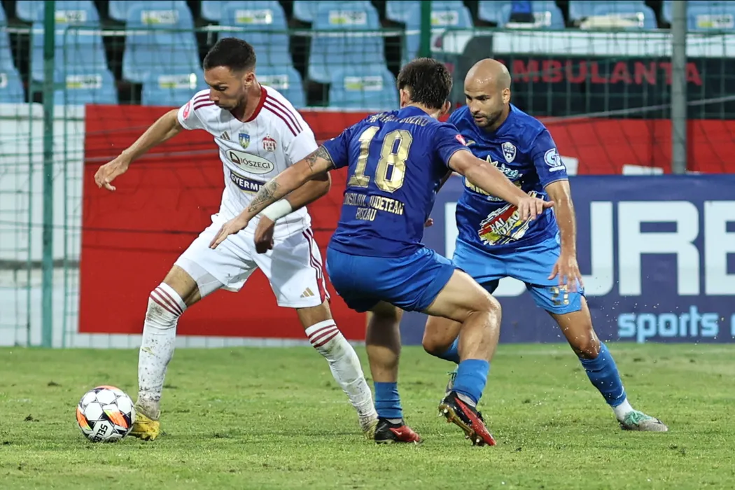 Sherif Kallaku și Dario Canadija în meciul de fotbal dintre Gloria Buzău și Sepsi OSK Sfantu Gheorghe, contând pentru SuperLiga Superbet, desfășurat pe Stadionul Gloria din Buzău, luni 22 iulie 2024. © FOTO: Gică FLUȘTER /SPORT PICTURES