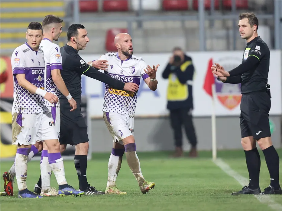 Arbitrul central Sorin Costreie, Iasmin Latovlevici si Arbitrul asistent Andrei Constantinescu in meciul de fotbal dintre UTA Arad si FC Arges, contand pentru Liga 1 Casa Pariurilor, desfasurat pe Stadionul Francisc Neuman din Arad, sambata 27 noiembrie 2021. © FOTO:Ciprian Petcut/SPORT PICTURES