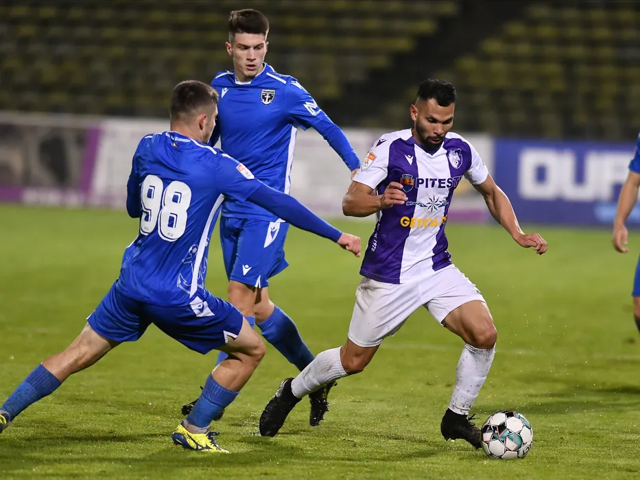 Gabriel Claudiu Bortoneanu si Cesar Daniel Meza Colli in meciul de fotbal dintre FC Arges si FC Voluntari, contand pentru Liga 1 Casa Pariurilor, desfasurat fara spectatori pe Stadionul Nicolae Dobrin din Pitesti, vineri 30 octombrie 2020. © FOTO:Razvan Pasarica/SPORT PICTURES
