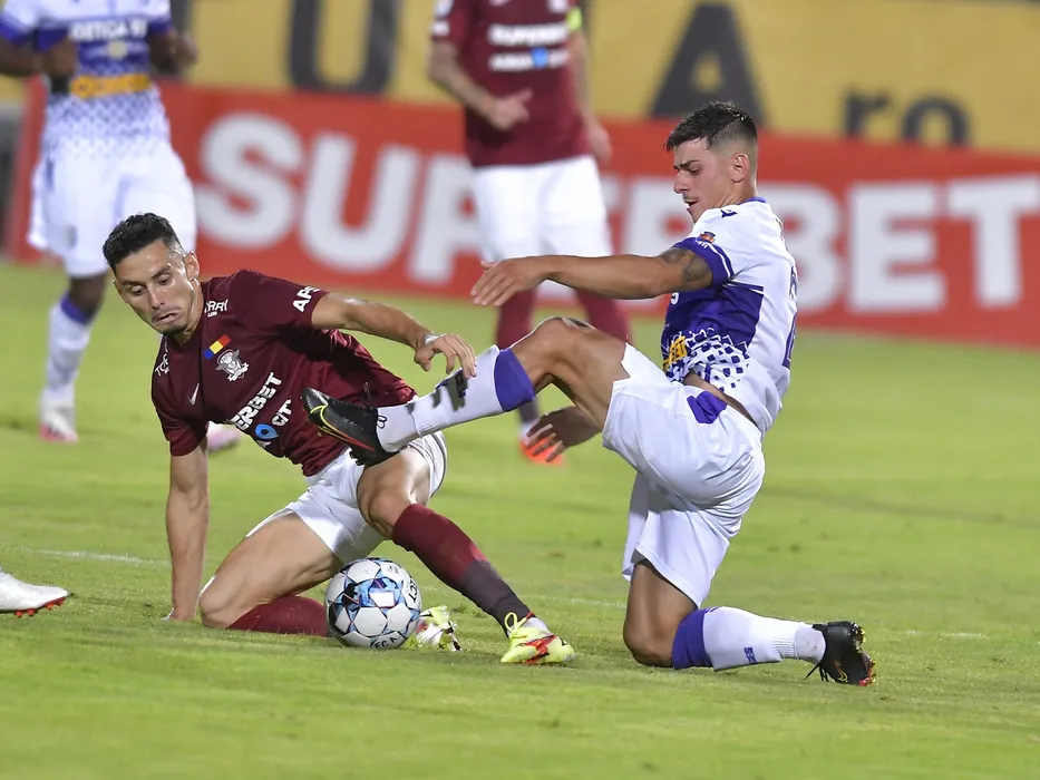 Nicolae Carnat si Costinel Andrei Tofan in meciul de fotbal dintre FC Arges si Rapid Bucuresti, contand pentru Liga 1 Casa Pariurilor, desfasurat pe Stadionul Nicolae Dobrin din Pitesti, sambata 7 august 2021. © FOTO:Razvan Pasarica/SPORT PICTURES
