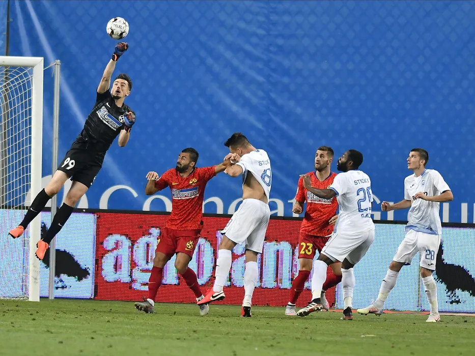 Andrei Daniel Vlad respinge o minge din careu de langa Valentin Cretu, Ovidiu Popescu, Stephane Acka si Mihai Valentin Mihaila in meciul de fotbal dintre Universitatea Craiova si FCSB, contand pentru play-off-ul Ligii 1 Casa Pariurilor, disputat fara spectatori pe Stadionul Ion Oblemenco din Craiova, duminica 12 iulie 2020. © FOTO:Razvan Pasarica/SPORT PICTURES