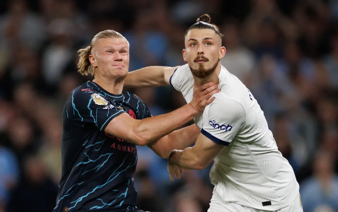 LONDON, ENGLAND - MAY 14: Erling Haaland of Manchester City tangles with Radu Dragusin of Tottenham Hotspur during the Premier League match between Tottenham Hotspur and Manchester City at Tottenham Hotspur Stadium on May 14, 2024 in London, England. (Photo by Marc Atkins/Getty Images)