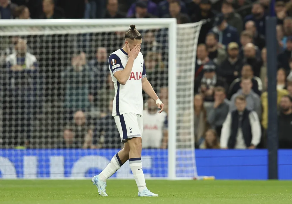 September 26, 2024, London: London, England, 26th September 2024. Tottenham's Radu Dragusin leaves the pitch after being sent off during the UEFA Europa League match at the Tottenham Hotspur Stadium, London.,Image: 912349360, License: Rights-managed, Restrictions: This content is intended for editorial use only. For other uses, additional clearances may be required.