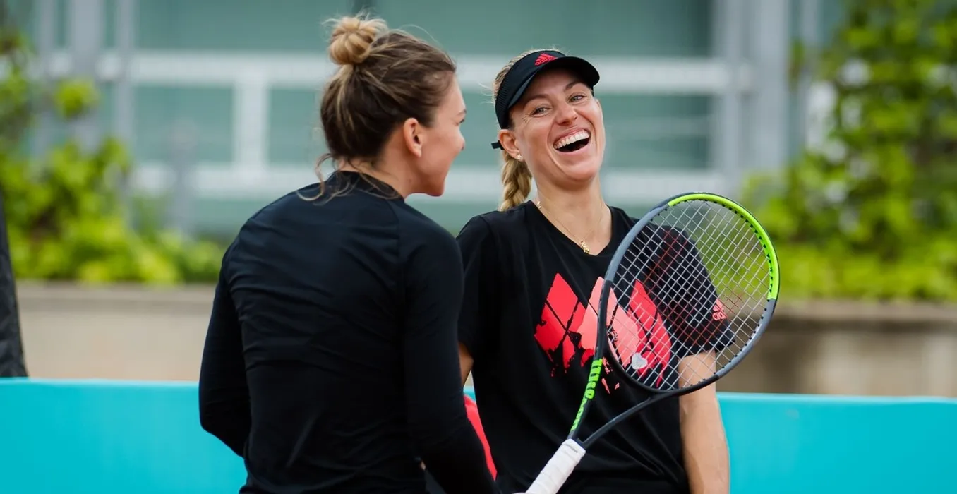 Simona Halep of Romania & Angelique Kerber of Germany during practice ahead of the 2021 Mutua Madrid Open WTA 1000 tournament