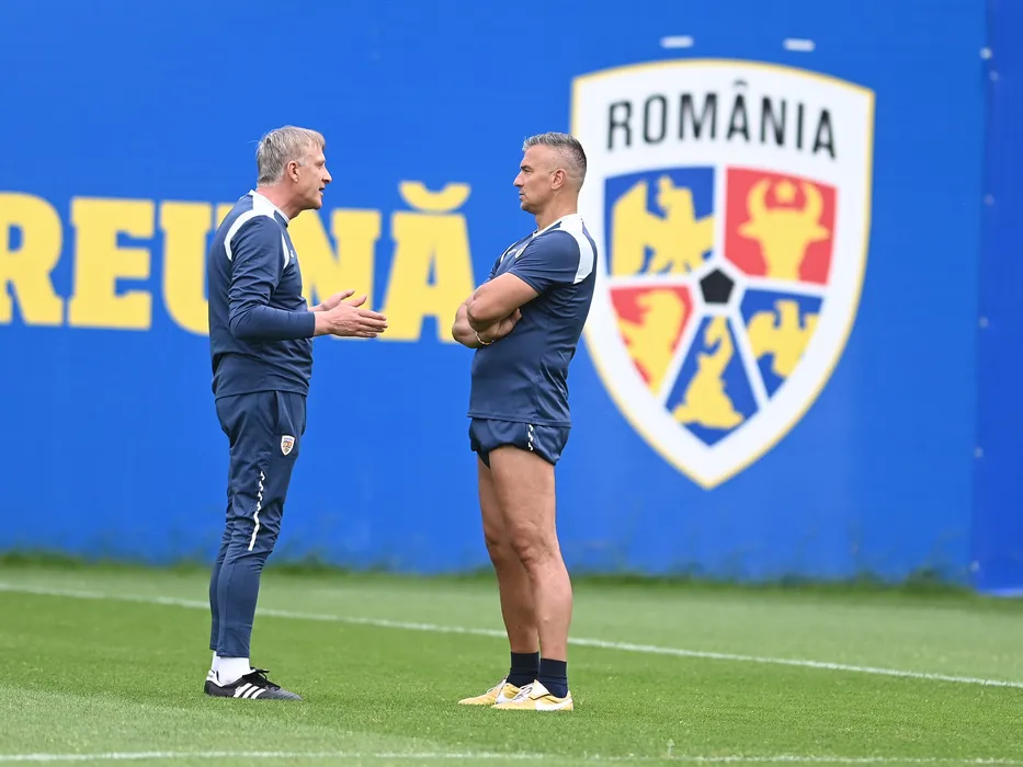 Antrenorii Emil Sandoi si Daniel Pancu discuta la antrenamentul Romaniei U21, pregatind debutul la Campionatul European U21, desfasurat la Centrul National de Fotbal de la Mogosoaia, joi 15 iunie 2023.© FOTO:Razvan Pasarica/SPORT PICTURES