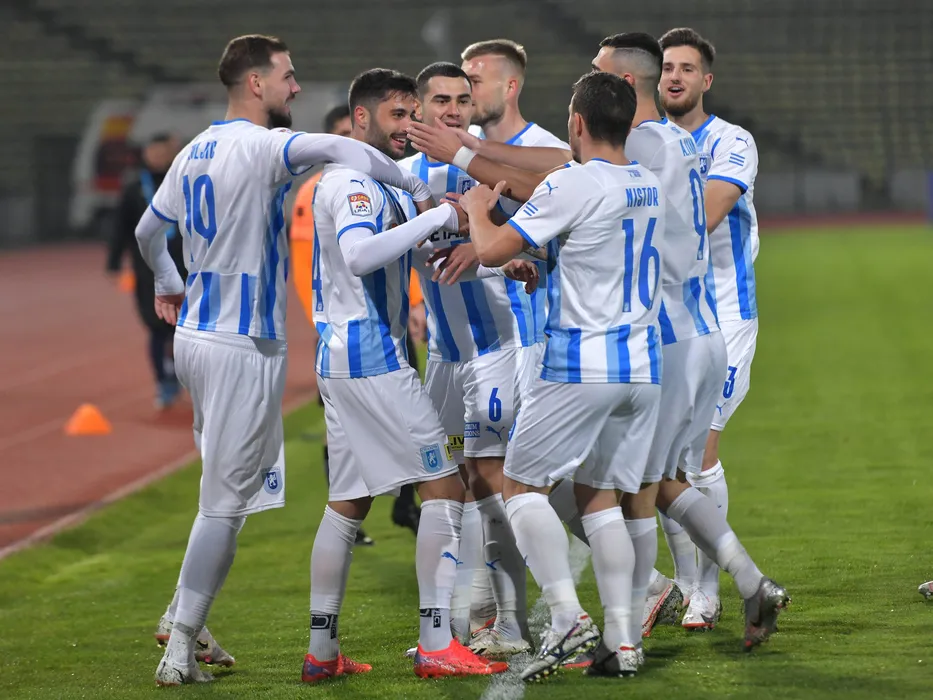 Bucurie a fotbalistilor craioveni Elvir Koljic, Ante Roguljic, Screciu Vladimir Ionut si Mihai Cristian Capatina dupa un gol marcat in meciul de fotbal dintre FC Arges si Universitatea Craiova, contand pentru Liga 1 Casa Pariurilor, desfasurat pe Stadionul Nicolae Dobrin din Pitesti, duminica 21 noiembrie 2021. © FOTO:Razvan Pasarica/SPORT PICTURES
