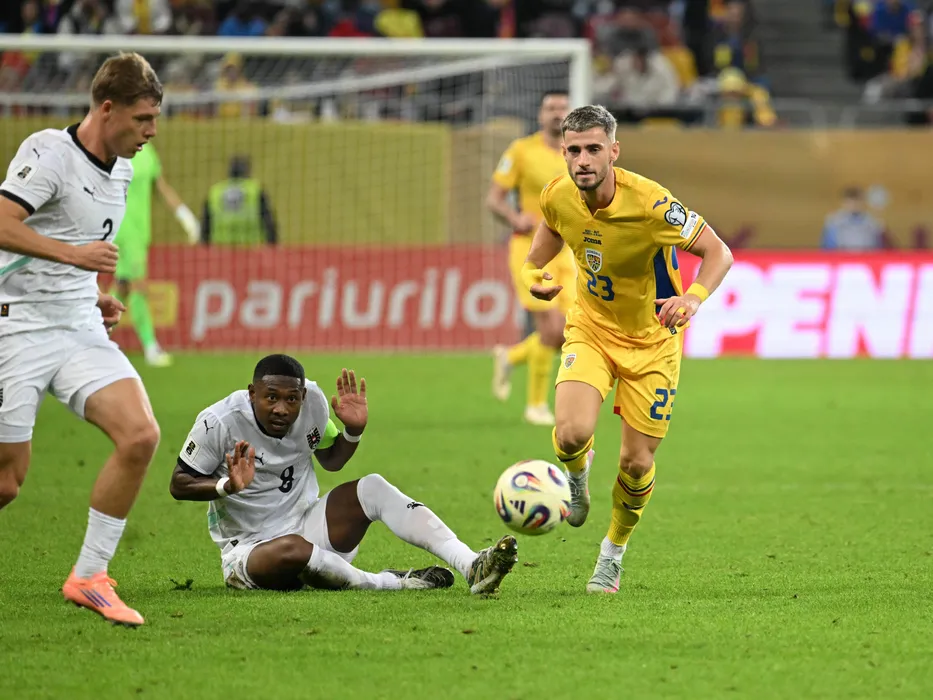 David Alaba si Vlad Dragomir la meciul de fotbal dintre Romania si Austria, din cadrul Preliminariilor Campionatului Mondial 2026, desfasurat pe Arena Nationala din Bucuresti, duminica 12 octombrie 2025. © FOTO:Razvan Pasarica/SPORT PICTURES