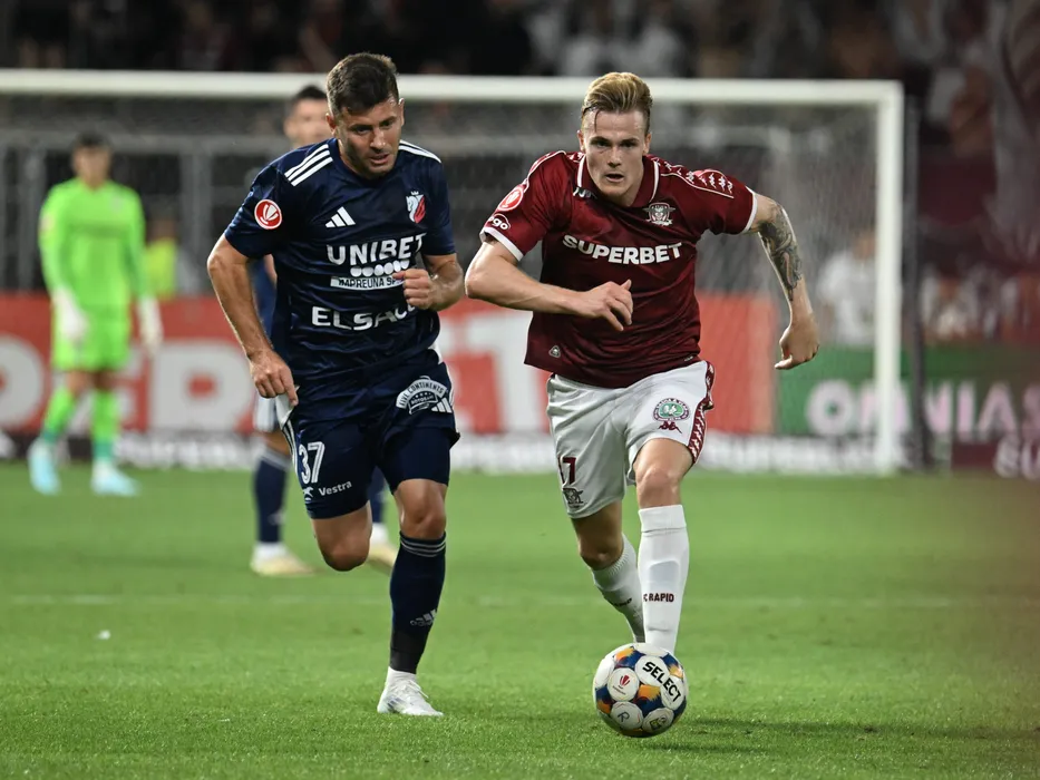 Mihai Catalin Bordeianu si Tobias Christensen in meciul de fotbal dintre Rapid Bucuresti si FC Botosani, din cadrul Superligii Superbet, desfasurat pe Superbet Arena-Giulesti din Bucuresti, luni 4 august 2025. © FOTO:Razvan Pasarica/SPORT PICTURES