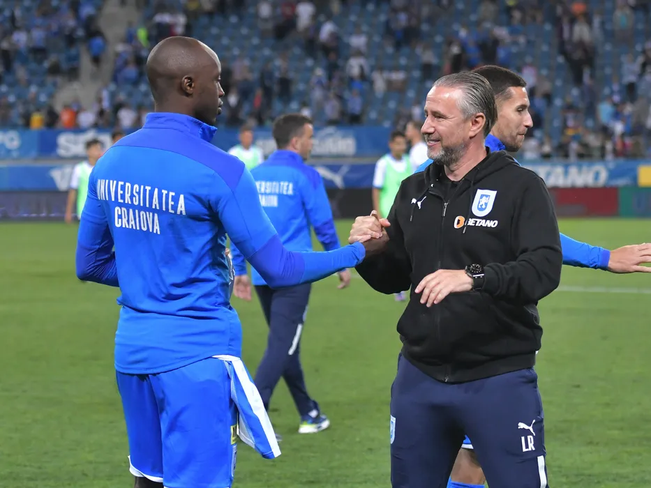 Laurentiu Aurelian Reghecampf se saluta cu Antoine Conte dupa meciul de fotbal dintre Universitatea Craiova si Farul Constanta, contand pentru Play-off-ul Ligii 1 Casa Pariurilor, desfasurat pe Stadionul Ion Oblemenco din Craiova, vineri 20 mai 2022. © FOTO:Razvan Pasarica/SPORT PICTURES