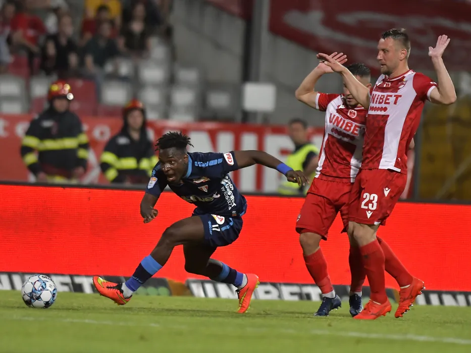 Philip Porwei Otele, Antoni Valeri Ivanov si Nichita Razvan Bogdan Patriche in meciul de fotbal dintre Dinamo Bucuresti si UTA Arad, contand pentru Play-out-ul Ligii 1 Casa Pariurilor, desfasurat pe Stadionul Dinamo din Bucuresti, vineri 13 mai 2022. © FOTO:Razvan Pasarica/SPORT PICTURES