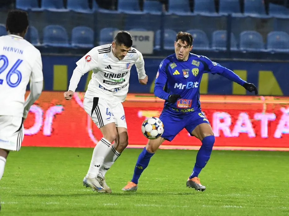 Ioan Andrei Vasile Dumiter si Marius Paul Antoche in meciul de fotbal dintre AFC Hermannstadt Sibiu si UTA Arad, contand pentru Superliga Superbet, desfasurat pe Stadionul Municipal din Sibiu, duminica 30 noiembrie 2025. © FOTO:Valentin Macrea/SPORT PICTURES