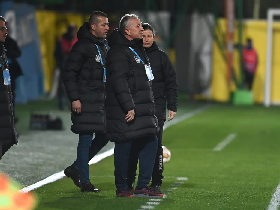 Dan Petrescu reactioneaza alaturi de Cristian Panin in meciul de fotbal dintre CS Mioveni si CFR Cluj, contand pentru Superliga Superbet, desfasurat pe Stadionul Orasenesc din Mioveni, duminica 13 noiembrie 2022. © FOTO:Razvan Pasarica/SPORT PICTURES