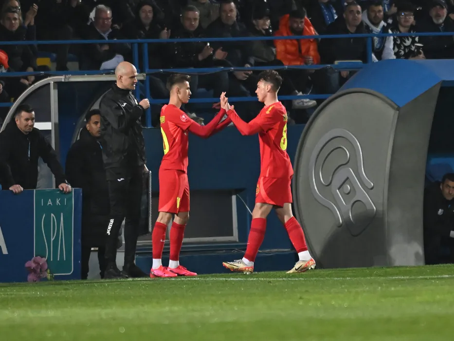 Octavian George Popescu il inlocuieste pe Eduard Gabriel Radaslavescu sub privirile arbitrului de rezerva Valentin Porumbel in meciul de fotbal dintre Farul Constanta si FCSB, contand pentru Play off-ul Superligii Superbet, desfasurat pe Stadionul central al Academiei Gheorghe Hagi din Ovidiu, duminica 31 martie 2024. © FOTO:Razvan Pasarica/SPORT PICTURES