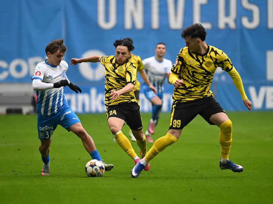 David Matei, Yassine Mohammed Zakir si Robert Gabriel Badescu in meciul de fotbal dintre Universitatea Craiova si Metaloglobus Bucuresti, contand pentru Superliga Superbet, desfasurat pe Stadionul Ion Oblemenco din Craiova, sambata 28 februarie 2026. © FOTO:Razvan Pasarica/SPORT PICTURES