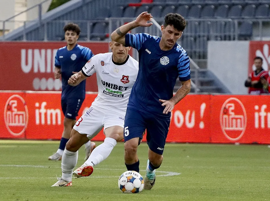 Damia Sabater Tous si Constantin Dragos Albu in meciul de fotbal dintre AFC Hermannstadt Sibiu si FC Metaloglobus Bucuresti, contand pentru Superliga Superbet, desfasurat pe Stadionul Municipal din Sibiu, vineri 18 iulie 2025. © FOTO:Valentin Macrea/SPORT PICTURES