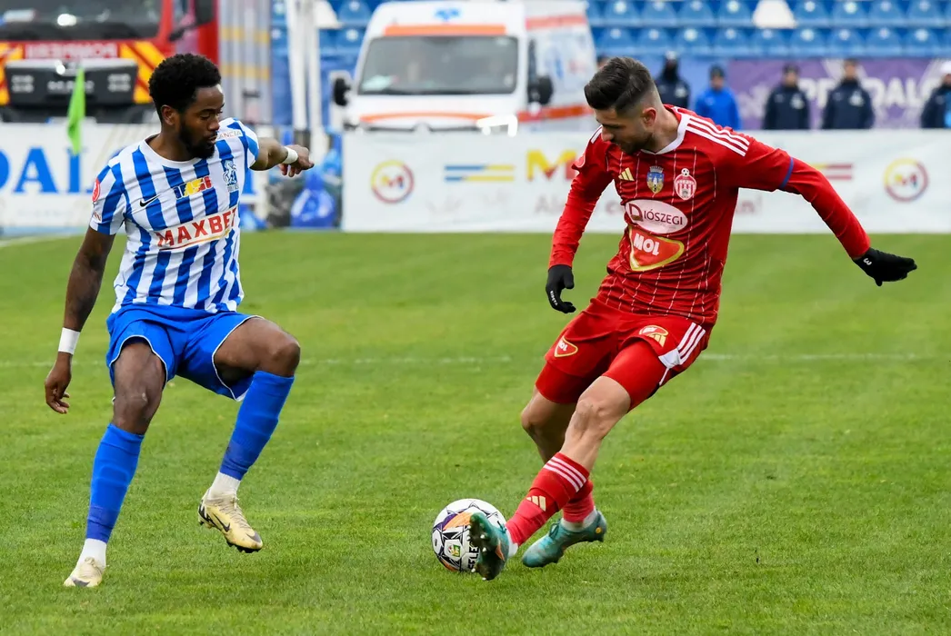 Florin Bogdan Ștefan și Shaydon Adam Harrison în meciul de fotbal dintre Poli Iași si Sepsi OSK Sfântu Gheorghe, contând pentru SuperLiga Superbet, desfășurat pe Stadionul Emil Alexandrescu din Iași, sâmbătă 9 noiembrie 2024. © FOTO: Tudi/SPORT PICTURES