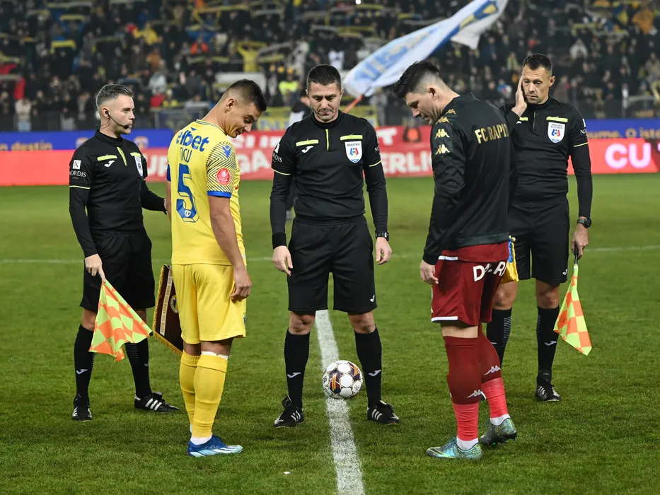 Brigada de arbitrii formata din Imre Laszlo Bucsi, Adrian Viorel Cojocaru si Alexandru Voda alaturi de capitanii Valentin Constantin Ticu sii Cristian Ionut Sapunaru in meciul de fotbal dintre Petrolul Ploiesti si Rapid Bucuresti, din cadrul Superligii Superbet, desfasurat pe Stadionul Ilie Oana din Ploiesti, vineri 15 decembrie 2023. © FOTO:Razvan Pasarica/SPORT PICTURES