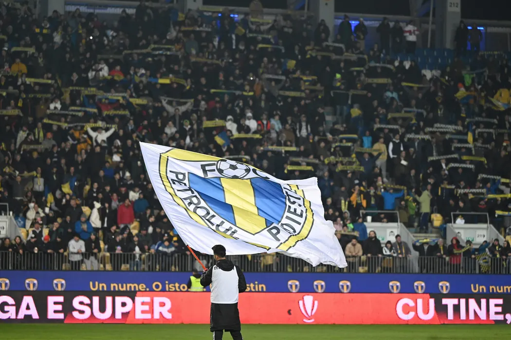 Suporterii ploiesteni canta imnul la startul meciului de fotbal dintre Petrolul Ploiesti si Rapid Bucuresti, din cadrul Superligii Superbet, desfasurat pe Stadionul Ilie Oana din Ploiesti, vineri 15 decembrie 2023. © FOTO:Razvan Pasarica/SPORT PICTURES