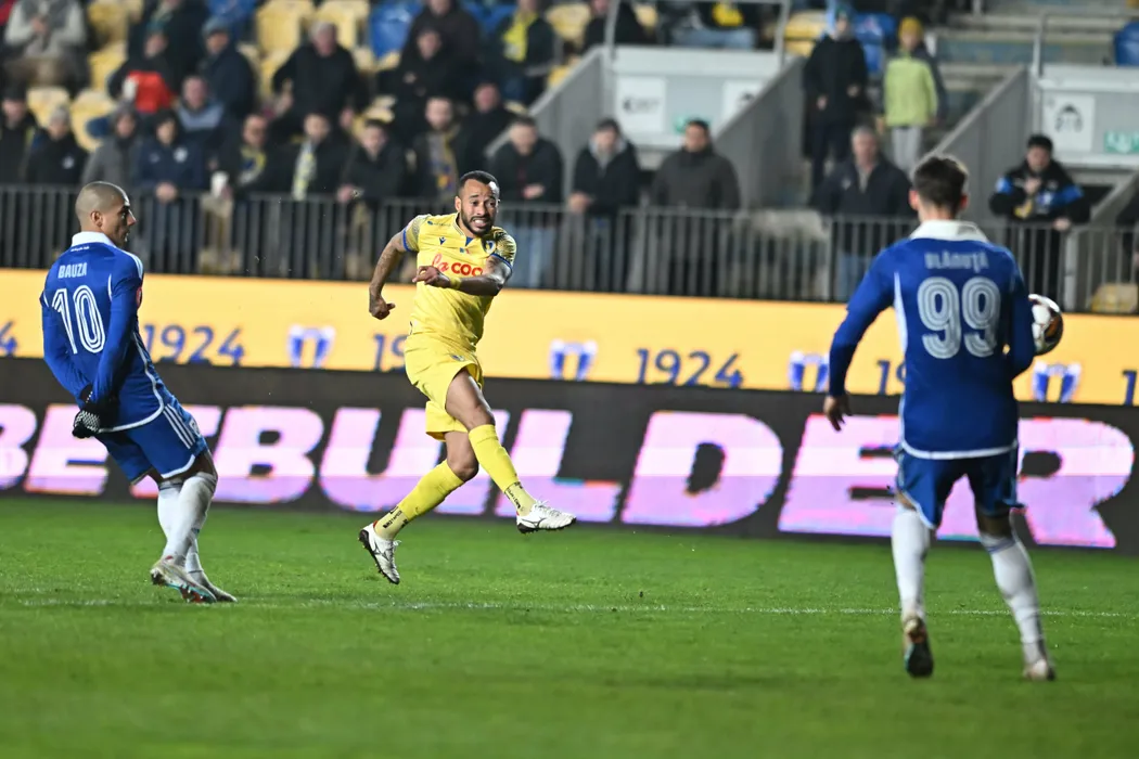 Jair Silva Tavares suteaza de langa Juan Francisco Bauza si Vladislav Blanuta la golul petrolist marcat în meciul de fotbal dintre Petrolul Ploiesti si FC U Craiova, contând pentru Play-out-ul Superligii Superbet, desfășurat pe Stadionul Ilie Oana din Ploiesti, luni 18 martie 2024. © FOTO: Răzvan PĂSĂRICĂ/SPORT PICTURES