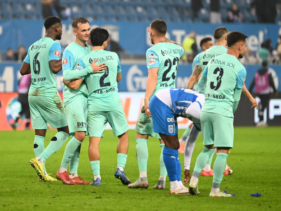 Fotbalistii aradeni Florent Gregoire Paulolo, Luca Alessandro Mihai, Mark Tutu si Ovidiu Marian Popescu se felicita dupa meciul dintre Universitatea Craiova si UTA Arad, contand pentru Superliga Superbet, desfasurat pe Stadionul Ion Oblemenco din Craiova, duminica 9 noiembrie 2025. © FOTO:Razvan Pasarica/SPORT PICTURES