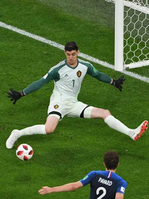 5585409 10.07.2018 Belgium's goalkeeper Thibaut Courtois makes a save during the World Cup semifinal soccer match between France and Belgium at the Saint Petersburg Stadium, in St.Petersburg, Russia, July 10, 2018. Alexei Danichev / Sputnik/ Hepta / Sport Pictures