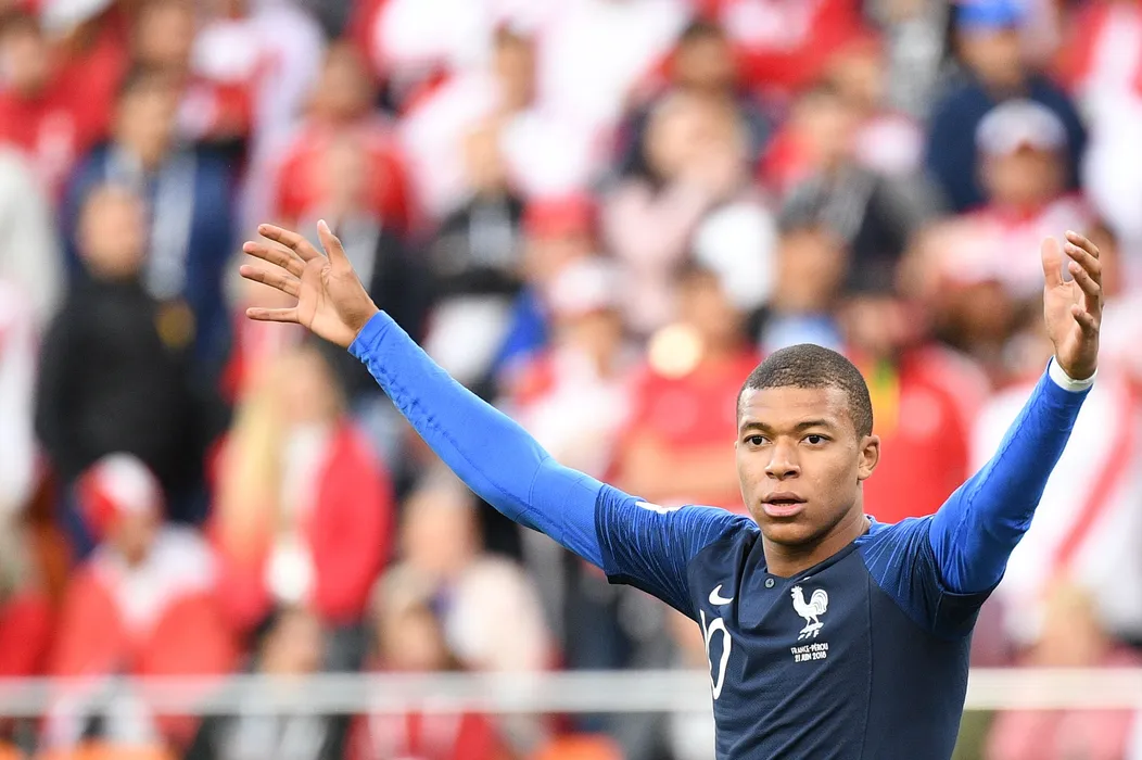 5547276 21.06.2018 France's Kylian Mbappe reacts during the World Cup Group C soccer match between France and Peru at the Ekaterinburg Arena in Yekaterinburg, Russia, June 21, 2018. Vladimir Astapkovich / Sputnik/ Hepta / Sport Pictures