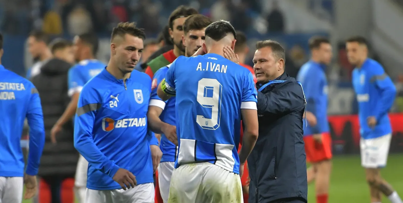 Andrei Virgil Ivan consolat de catre Alexandru Mateiu si Thomas Neubert dupa meciul de fotbal dintre Universitatea Craiova si FCSB, contand pentru Play-off-ul Superligii Superbet, desfasurat pe Stadionul Ion Oblemenco din Craiova, duminica 30 aprilie 2023. © FOTO:Razvan Pasarica/SPORT PICTURES