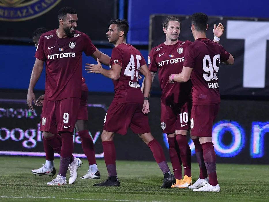 Bucurie a fotbalistilor de la CFR cu Billel Abdel Slem Omrani, Mario Camora si Ciprian Ioan Deac dupa un gol marcat in meciul de fotbal dintre FC Viitorul Constanta si CFR Cluj, contand pentru Liga 1 Casa Pariurilor, desfasurat fara spectatori pe Stadionul Central al Academiei Gheorghe Hagi din Ovidiu, duminica 4 octombrie 2020. © FOTO:Razvan Pasarica/SPORT PICTURES