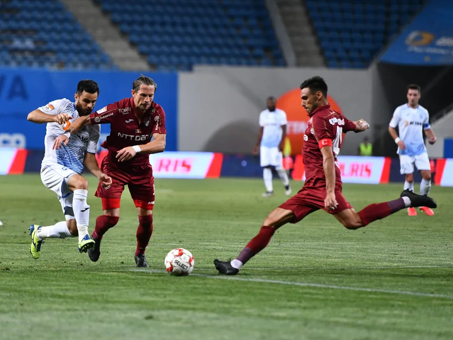 Cristian Barbut, Ciprian Deac si Mario Camora in meciul de fotbal dintre Universitatea Craiova si CFR Cluj, contand pentru play-off-ul Ligii 1 Casa Pariurilor, disputat fara spectatori pe Stadionul Ion Oblemenco din Craiova, luni 3 august 2020. © FOTO:Razvan Pasarica/SPORT PICTURES