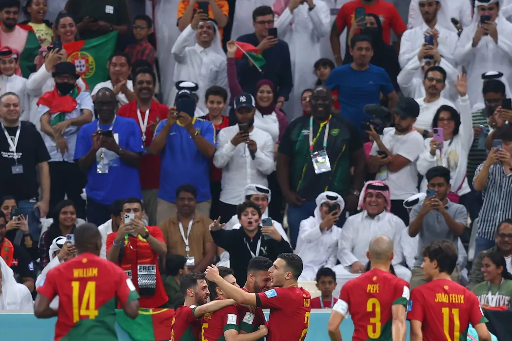 06 December 2022, Qatar, Lusail: Portugal players celebrate scoring their side's third goal during the FIFA World Cup Qatar 2022 Round of 16 soccer match between Portugal and Switzerland at the Lusail Stadium. Photo:/dpa