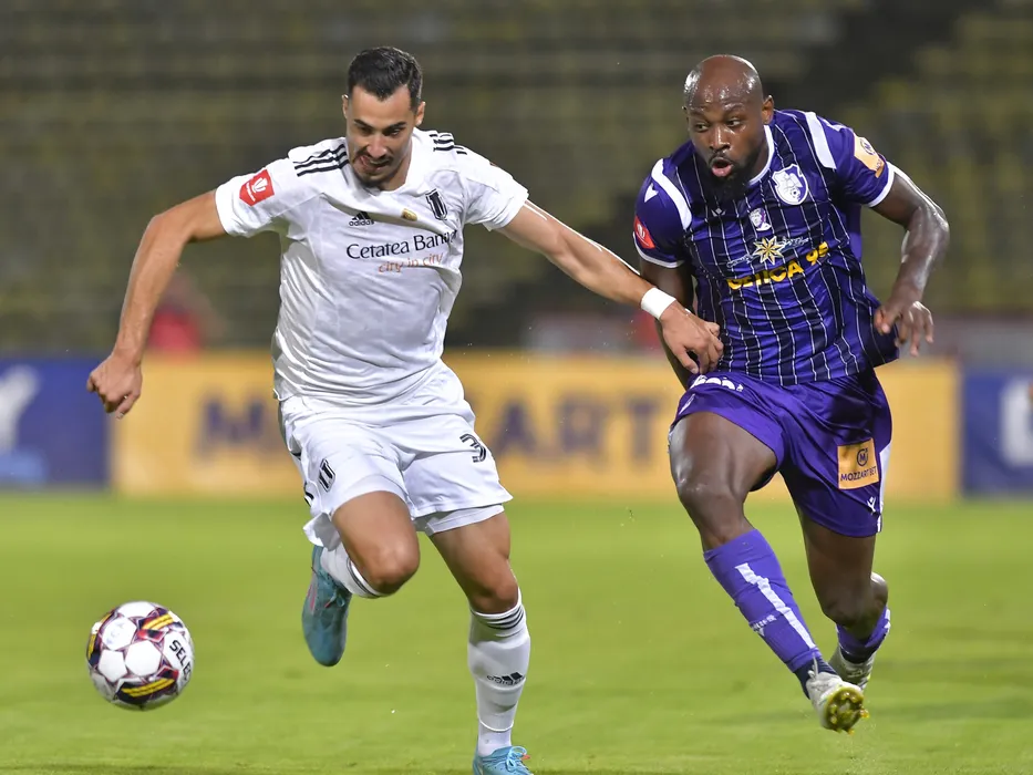 Duarte Andre Lourenco si Paul Arnold Garita in meciul de fotbal dintre FC Arges si FC U Craiova, contand pentru Superliga Superbet, desfasurat pe Stadionul Nicolae Dobrin din Pitesti, sambata 12 august 2022. © FOTO:Razvan Pasarica/SPORT PICTURES