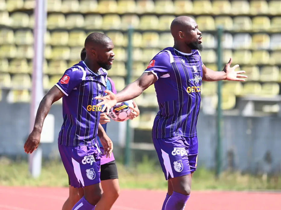 Paul Arnold Garita se bucura dupa un gol marcat alaturi de Tony Wilfried Nyandjou Njike in meciul de fotbal dintre FC Arges si Chindia Targoviste, contand pentru Superliga Superbet, desfasurat pe Stadionul Nicolae Dobrin din Pitesti, duminica 28 august 2022. © FOTO:Razvan Pasarica/SPORT PICTURES