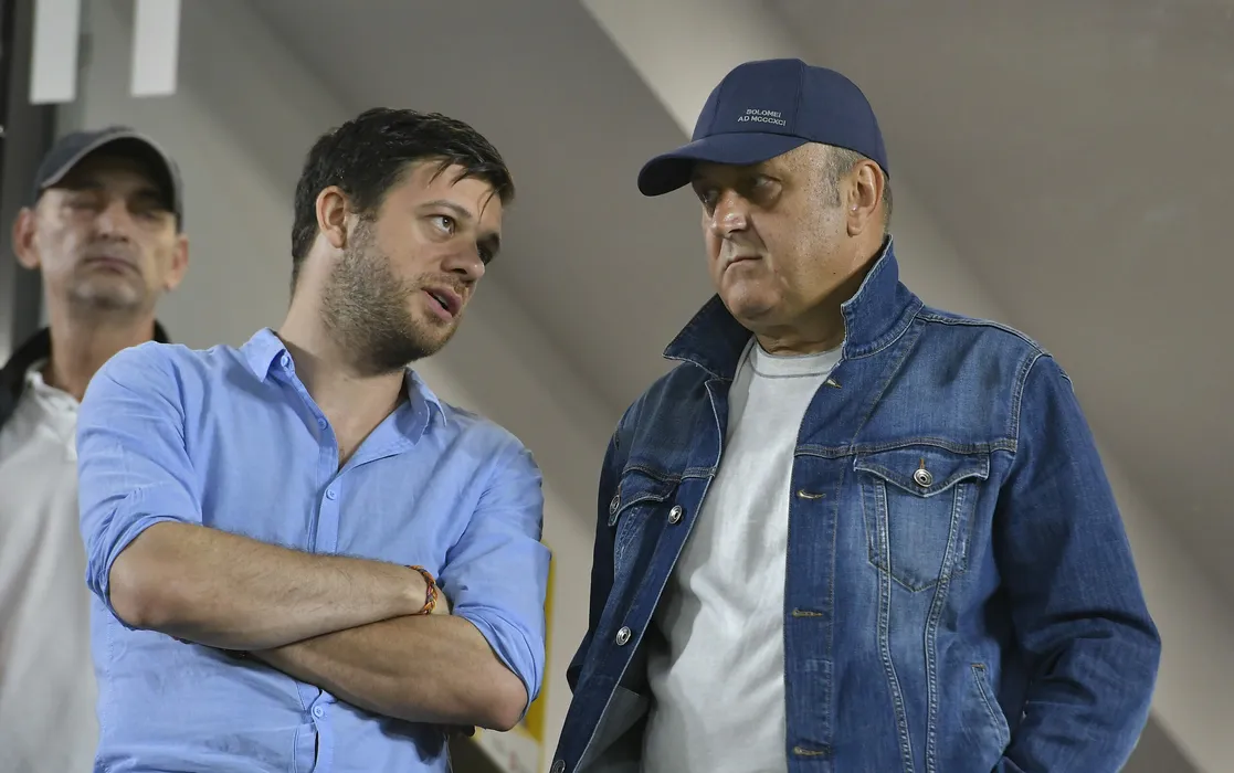 Victor Angelescu si Dan Sucu discuta in tribuna la meciul de fotbal dintre Romania si Muntenegru, contand pentru Liga Natiunilor, desfasurat pe Stadionul Rapid Giulesti din Bucuresti, marti 14 iunie 2022. © FOTO:Razvan Pasarica/SPORT PICTURES