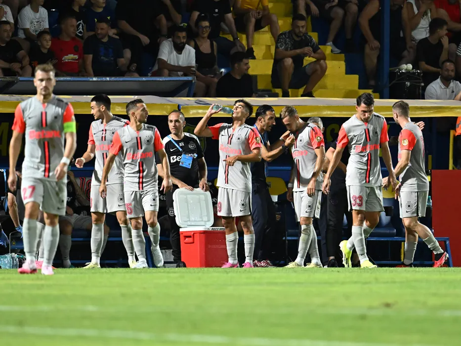 Fotbalistii stelisti printre care Adrian Gheorghe Șut, Marius Stefanescu, Alexandru Marian Musi, Mihai Daniel Lixandru si Risto Radunovic la o pauza de hidratare luata alături de antrenorul lor Elias Charalambous in meciul dintre Unirea Slobozia si FCSB, contand pentru Superliga Superbet, desfasurat pe Clinceni Arena din Clinceni, vineri 19 iulie 2024. © FOTO:Razvan Pasarica/SPORT PICTURES