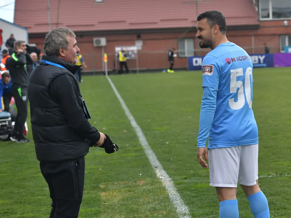 Gheorghe Hagi discuta cu Constantin Valentin Budescu inaintea meciului de fotbal dintre FC Voluntari si Farul Constanta, contand pentru Play-off-ul Ligii 1 Casa Pariurilor, desfasurat pe Stadionul Anghel Iordanescu din Voluntari, sambata 2 aprilie 2022. © FOTO:Razvan Pasarica/SPORT PICTURES