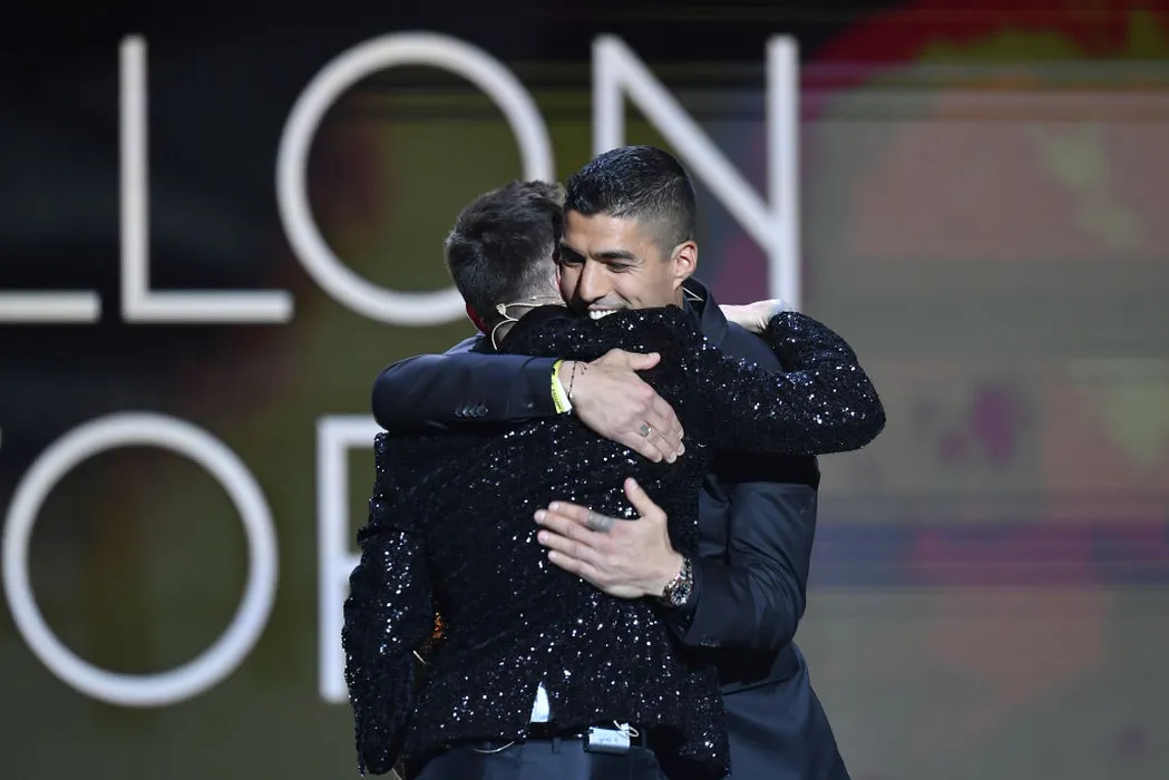 PARIS, FRANCE - NOVEMBER 29: Luis Suárez (URY/CA Madrid) awards Lionel Messi (ARG / PSG) with the Ballon d'Or Trophy during the Ballon D'Or ceremony at Theatre du Chatelet on November 29, 2021 in Paris, France. (Photo by Aurelien Meunier/Getty Images)