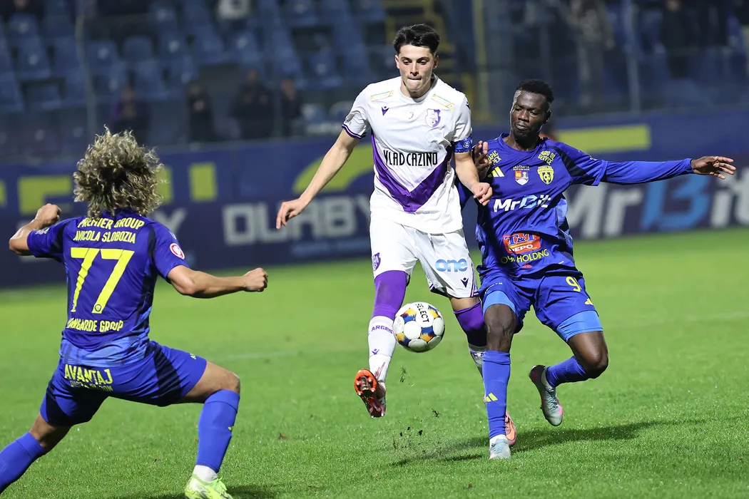 Mario Cristian Tudose si Nkama Christ Afalna in meciul de fotbal dintre AFC Unirea 04 Slobozia si FC Arges, contand pentru Superliga Superbet, desfasurat pe Stadionul Clinceni Arena din Clinceni, sambata 1 noiembrie 2025. © FOTO:Gheorghe Fluster/SPORT PICTURES