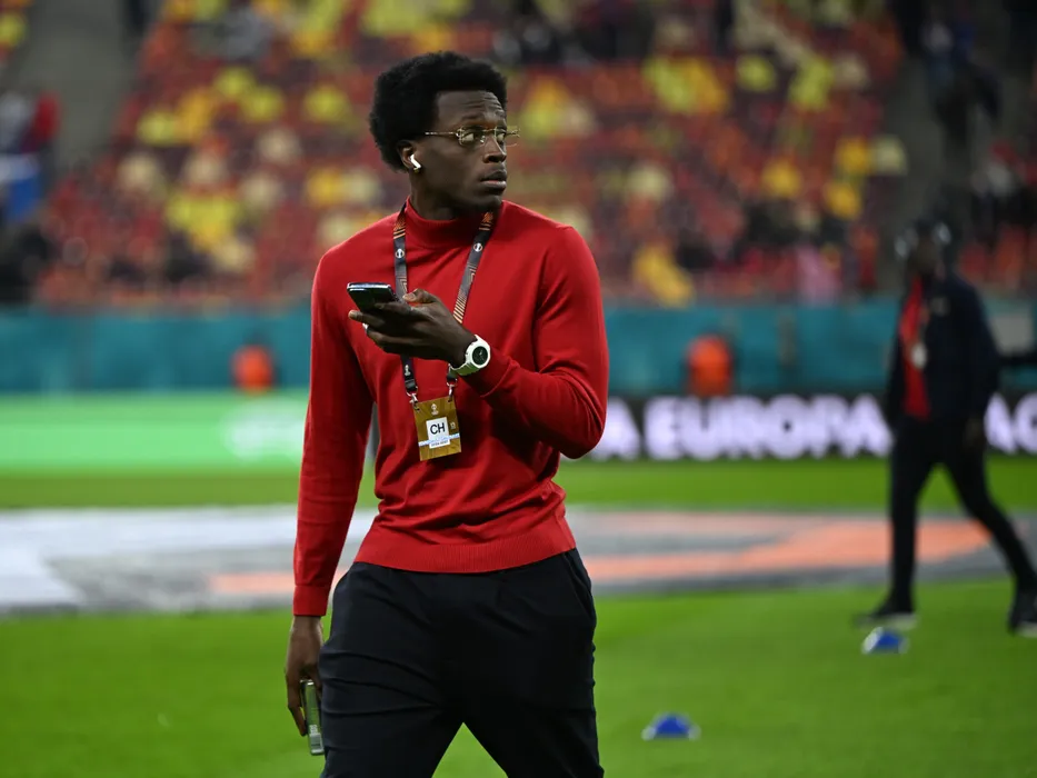 Joyskim Aurelien Dawa Tchakonte la inspectia terenului inaintea meciului de fotbal dintre FCSB si Olympique Lyon, din cadrul UEFA Europa League, desfasurat pe Arena Nationala din Bucuresti, joi 6 martie 2025. © FOTO:Razvan Pasarica/SPORT PICTURES