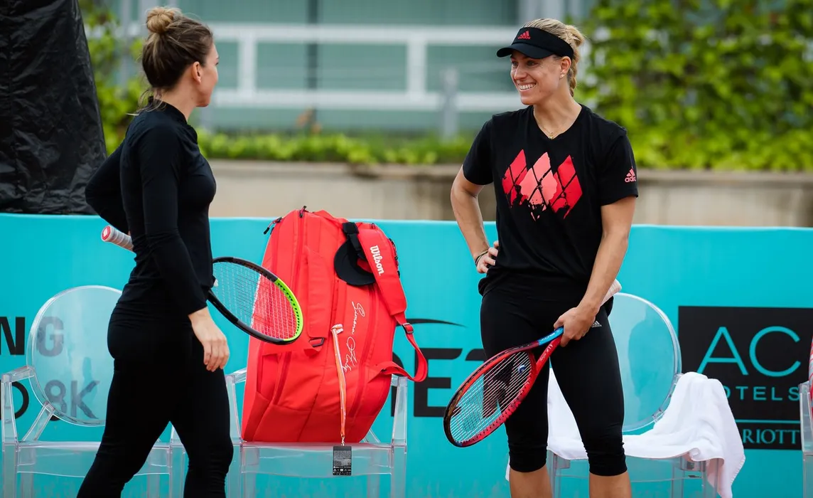 Simona Halep of Romania & Angelique Kerber of Germany during practice ahead of the 2021 Mutua Madrid Open WTA 1000 tournament Mutua Madrid Open Qualifying, Tennis, La Caja Magica, Madrid, Spain - 28 Apr 2021,Image: 608390939, License: Rights-managed, Restrictions: , Model Release: no, Credit line: Profimedia