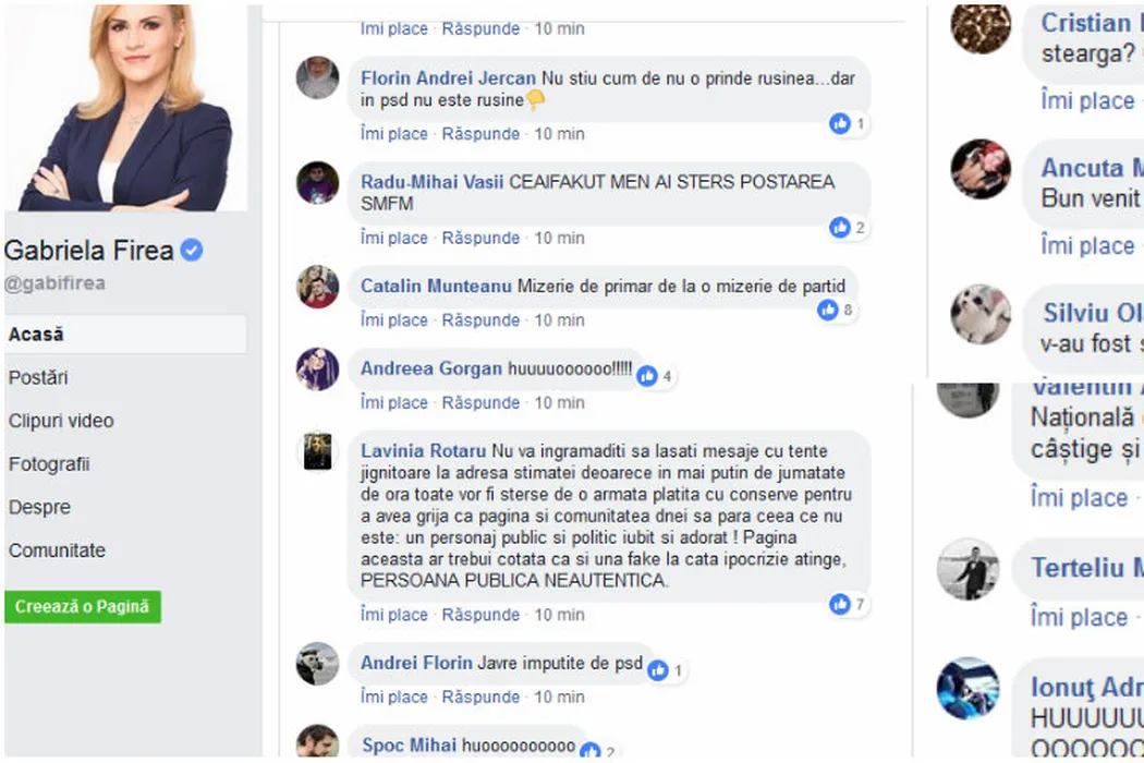 „Aparatul lucrează”. Gabriela Firea și-a redeschis pagina de Facebook după ce a șters toate comentariile potrivnice și a activat postacii, însă la scurt timp l-a închis din nou! Bucureștenii au atacat la foc automat