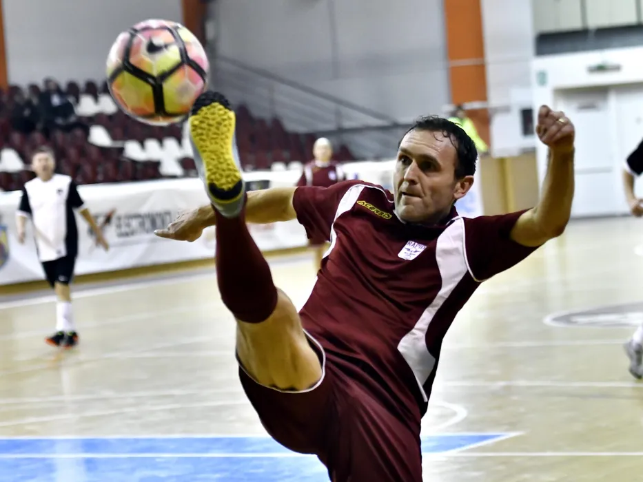 Mugur Bolohan se lupta pentru minge in meciul amical de futsal intre Rapid Old Boys si Sportul Studentesc, disputat in sala Rapid din Bucuresti, 10 februarie 2017. Razvan Pasarica/ Sport Pictures